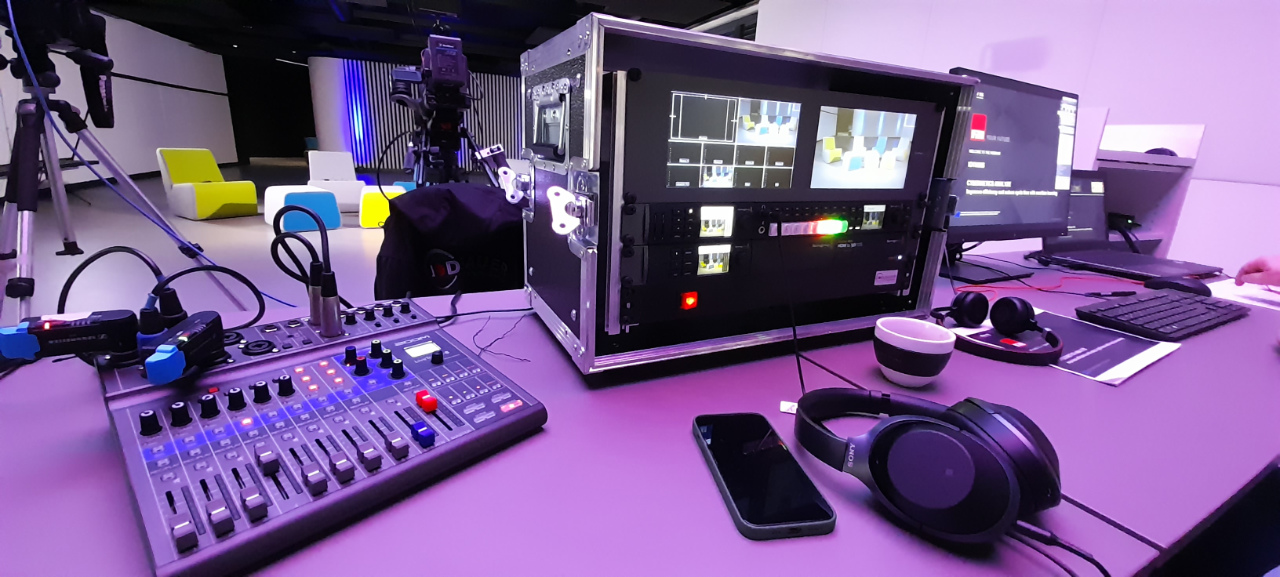 Dazu gehört nicht nur der Bereich Video- und Audiotechnik vor Ort, sondern auch beispielsweise das Veranstaltungskonzept von der Bühne, der Lichttechnik als auch der Projektions- und Präsentationstechnik bis hin zur Liveübertragung z.B. ins Internet.